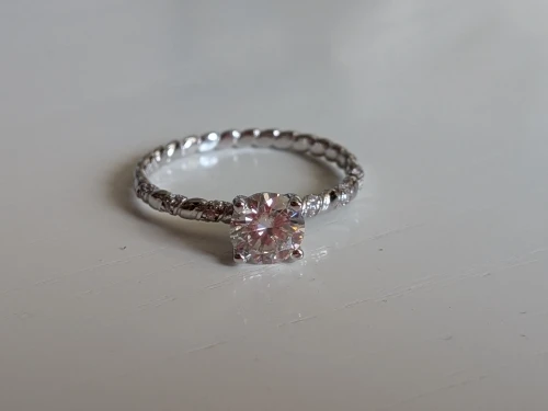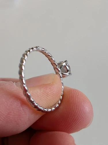 A modern solitaire design featuring a brilliant moissanite suspended above an intricately twisted band. Accented with fine cubic zirconia detailing, the band enhances light and movement, creating a silhouette that feels sculptural, refined, and distinctly contemporary.